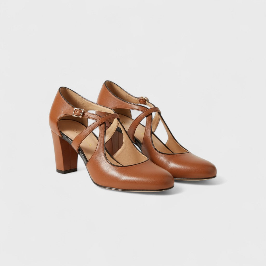 Estes sapatos castanhos reinventam o charme vintage com detalhes modernos. O fecho cruzado e os recortes laterais conferem elegância, enquanto o salto bloco garante estabilidade e conforto.