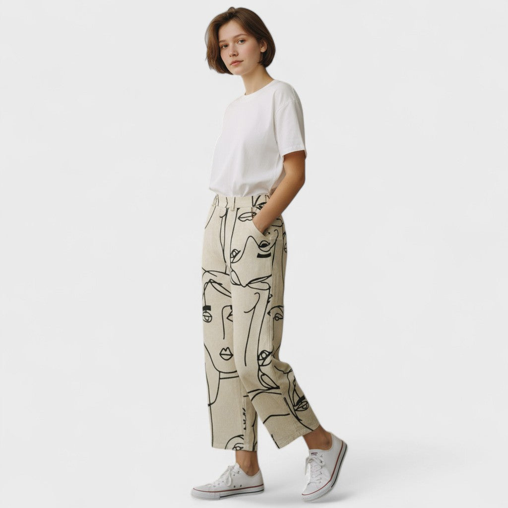 Estas calças de linho bege destacam-se pelo estampado facial exclusivo, conferindo um toque artístico ao seu look. Com cintura elástica e ajuste confortável, são ideais para quem procura originalidade sem abdicar do bem-estar.