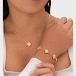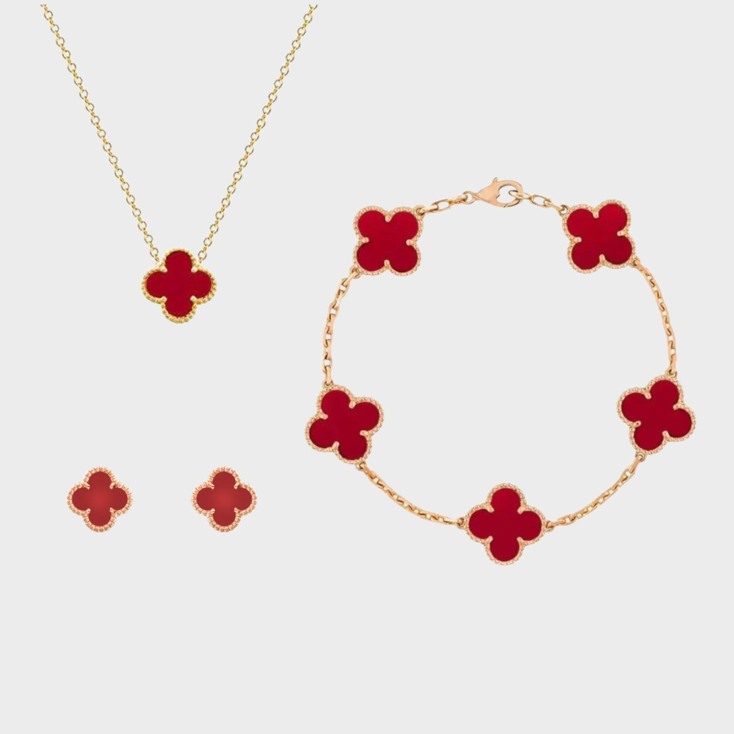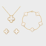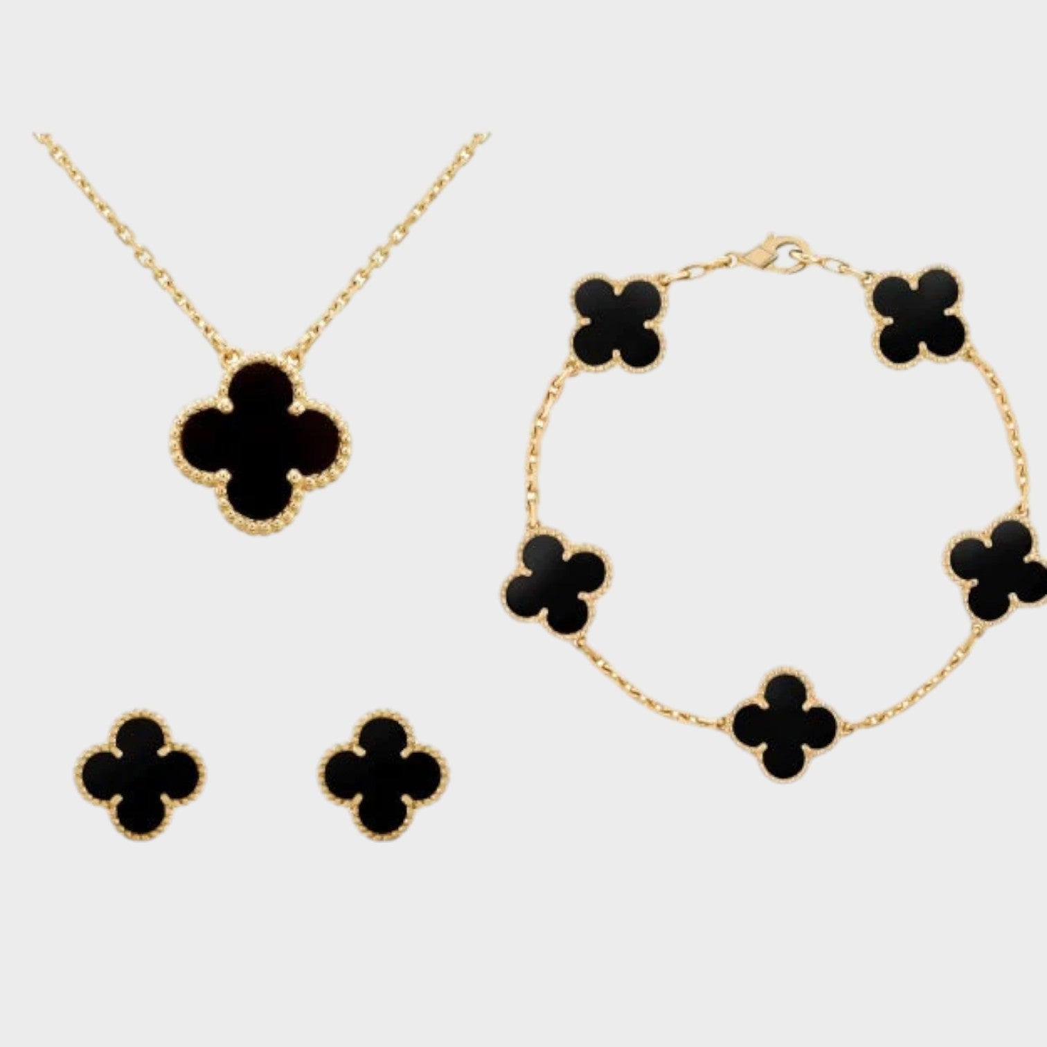 Sorte e elegância num conjunto único. Este set inclui colar, pulseira e brincos com delicados motivos de trevo, simbolizando charme e boa sorte. Use em conjunto para um look marcante ou separadamente para um toque subtil.